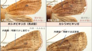 カシワオビキリガとミヤマオビキリガほか近縁5種の見分け方【Conistra属】